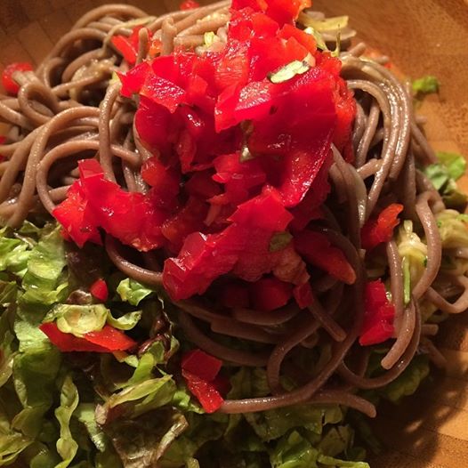 Not all of the ingredients in this sauce are raw, however feel free to add in, subtract out what you need. Just the perfect amount of spicy heat. I sauced up some organic gluten free buckwheat noodles and sprinkled black sesames atop…nomnomnomnomnom