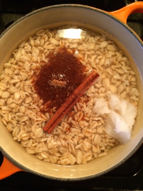 In a non reactive pot, add in the oats, salt, lemon juice and water and let stand overnight on the stove- no heat, just to soak or soak for at least 8 hours. The acid from the lemon helps to break down the phytic acid in the grain, making it easier to digest and absorb the nutrient content in the oats- this goes for all grains! You can cook in the soaking liquid. Soaking also substantially shortens cooking time for grains which is always a plus.