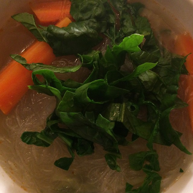 So ya…I overtrained…got sick. I walked out into the cold air on Sunday and like a slap in the face, I was sick. Just like that. So now I am eating simple foods and resting…a lot. I have made this soup for the past two days and I am convinced that practice is mastery- the more you do, the better you or it becomes- the broth in this case. It is a simple, clear broth- I didn’t want tamari or that soy sauce taste and I didn’t want the bouillon taste- I wanted that full flavorful taste of asian broths that appear almost clear, nothing floating around in it, nothing to get in the way of the taste. The first night I tried with garlic and I found that, tho it was tasty, it had that raw garlic taste that to me seemed a little bit overwhelming. Last night I omitted the garlic and stuck with the ginger and onions. I think I am in love. Scallions would be even better I suspect. The broth takes less than 10 minutes to make- less even- then I added in beautiful local veggies; nappa cabbage, carrots, fresh spinach. You could definitely expound on this premise- flavor the broth with mushrooms etc- this was me, in a pinch, sick, after work- and it was D E L I C I O U S.
