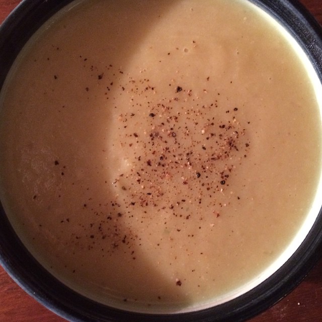 My friend Kim handed me a kohlrabi today and said “HERE”. She had gotten it from her winter CSA and didn’t know what to do with it. I didn’t know what to do with it….What the F is a kohlrabi? A turnip? Cabbage? She challenged me to make something with it….She also handed off her leeks to me so I knew there was a soup waiting to happen, especially on such a cold and gray day…IT. IS. PHHHHEEENomenal…..MAKE it.