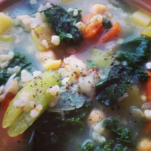 In a large soup pot, add the olive oil and sauté the onions and garlic until golden and soft. Add the carrots, celery, salt, black and red pepper. Continue to sauté until the veggies turn bright, stirring often. Add the chickpeas, potatoes and the rice, mixing them into the vegetables. Add the boiling water and bring to a boil and reduce heat and simmer for 30-40 minutes. In the last 5 minutes of cooking, add the fresh corn and kale.