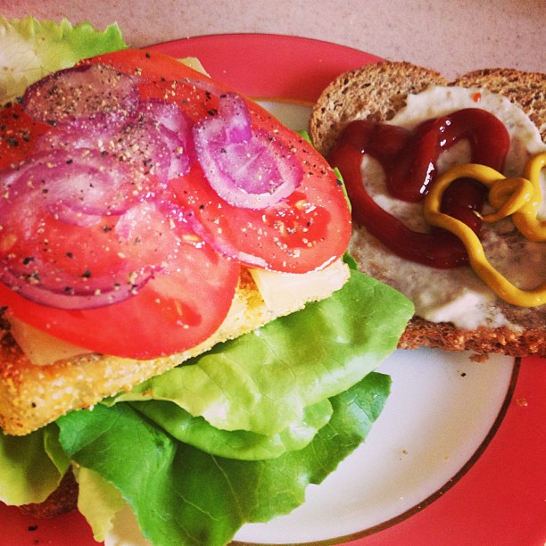 Another crazy hard crossfit workout this morning!!! Thrusters and GHD sit-ups – SO GOOD. Came home on a mission to eat and had two lovely heirloom tomatoes on the counter that were screaming to be used. I chopped them up and remembered I had both basil and arugala pesto in the fridge. Seeing as I used all of my miso paste up making the pesto, I used what I had left of the miso and supplemented with the arugala pesto AND OH MY GODDESS…..YUMNESSSSS!!!!