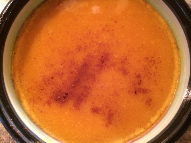 In a large soup pot, add the oil and sauté the onions, and garlic with the sweetener until golden and soft. Add the cumin, turmeric (if using dried), cinnamon, salt, black and red pepper. Add the roasted squash, the boiling water, the bouillon cube (or powder). Bring to a boil and reduce heat and simmer for 20-25 minutes.